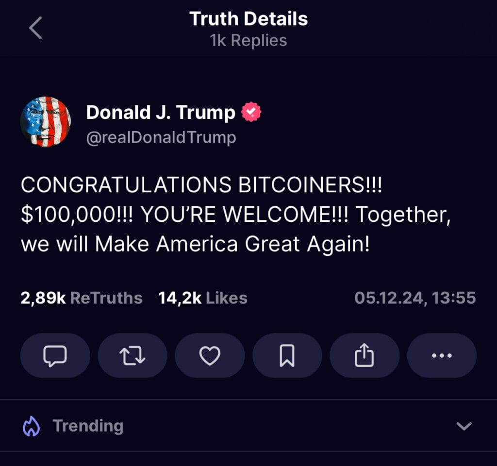 CategoriesPosted inin NewsPresident-elect Trump congratulates Bitcoin holders on surpassing $100,000Posted byby Diamond HandsDecember 5, 20240 Comments2 minShare Continue Reading2 min